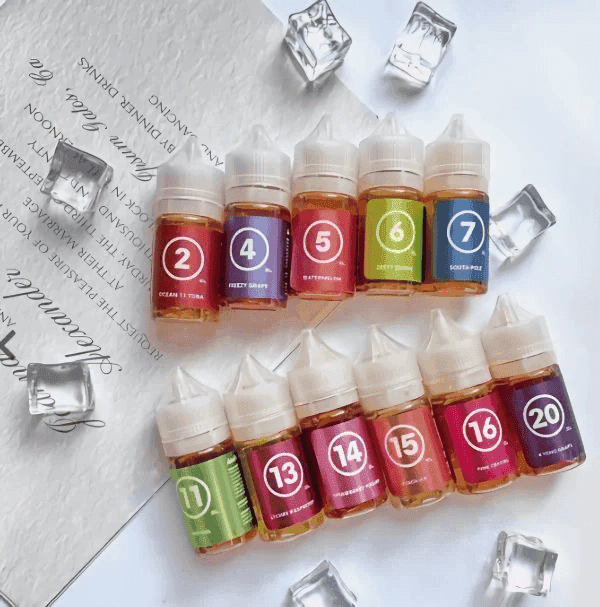 02威士忌雪茄, 03芒果, 04冰川葡萄, 05西瓜冰, 06檸檬蘇打, 07南極薄荷, 08莓果派對, 09水果盛典, 10法式檸檬塔, 11野薄荷, 12蜜桃威士忌, 13荔枝覆盆莓, 14草莓優格, 15蜜桃冰, 16彩虹糖, 17蜂蜜西柚, 18焦糖煙草, 19極地薄荷, 20巨峰葡萄, 21鳳梨芒果, 22冰橙, 23紅蘋果, 24香蕉冰, 25冰可樂, 26橘子, 27芭樂, 28泡泡糖, 29藍莓, 30菸草, 31混合煙草